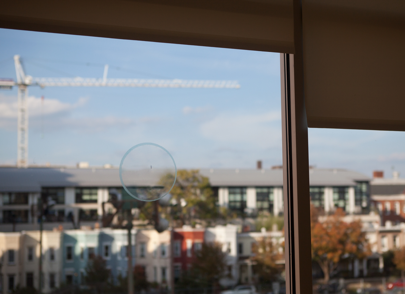 Philip Looking at Philip, 2011 8x8" Acetate window cling with tiny image of collector positioned for his height so he can view himself on the roof across the street from the gallery window.