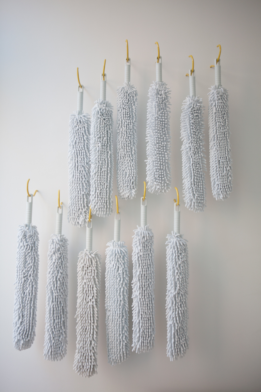 Buffering message machines, 2011 26" x 4" x 6" hook, cleaning brishes, messages between artist and collector